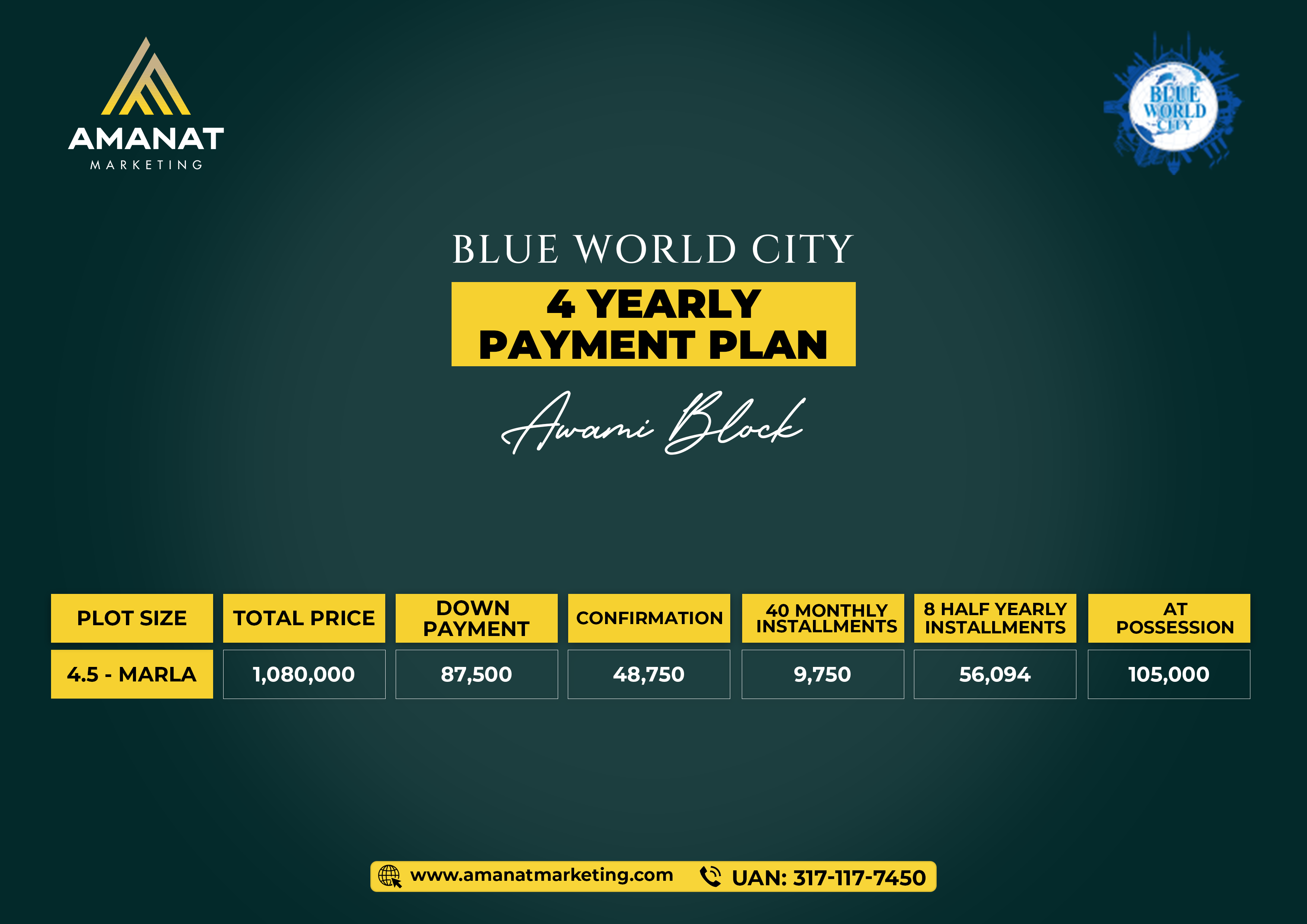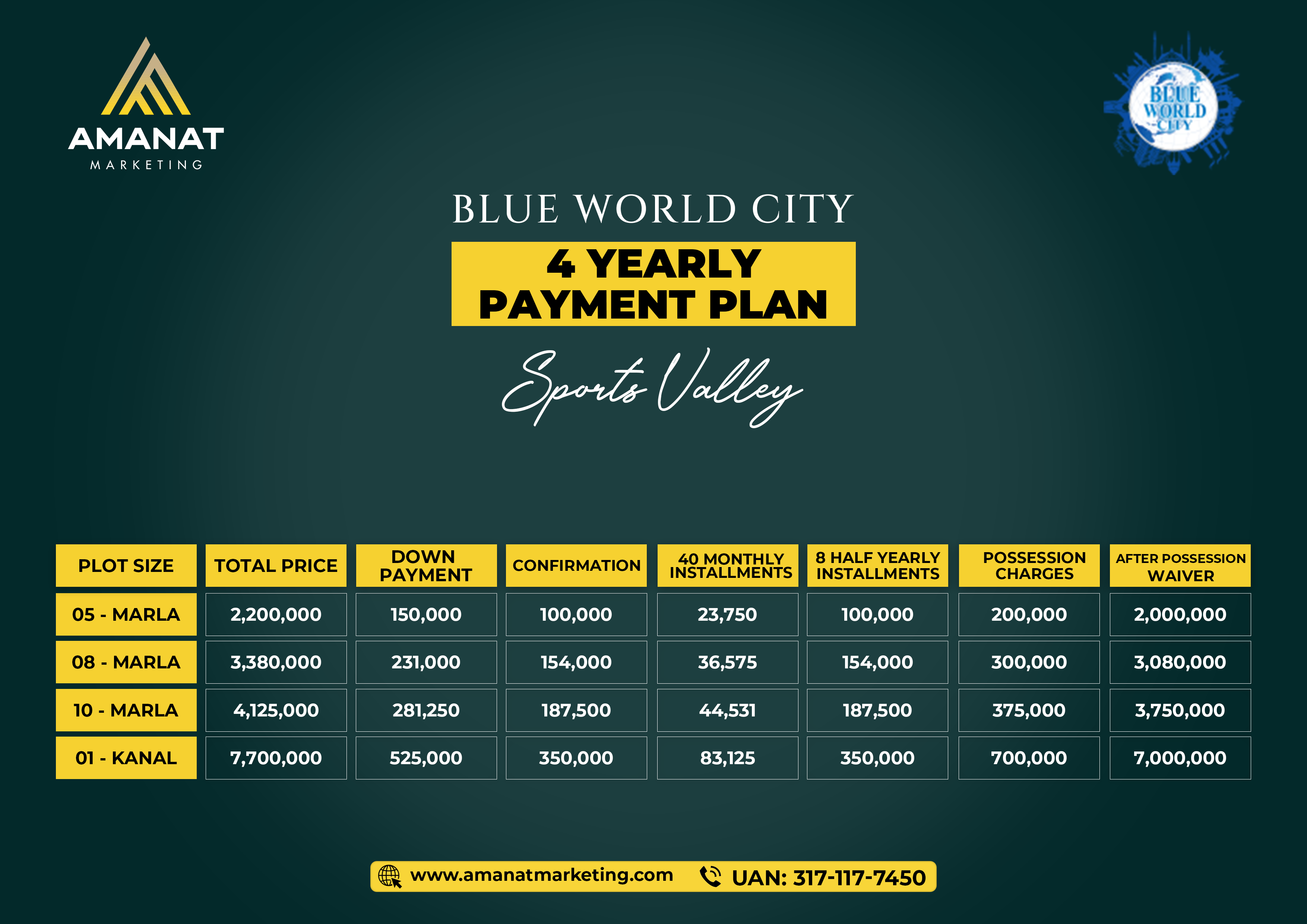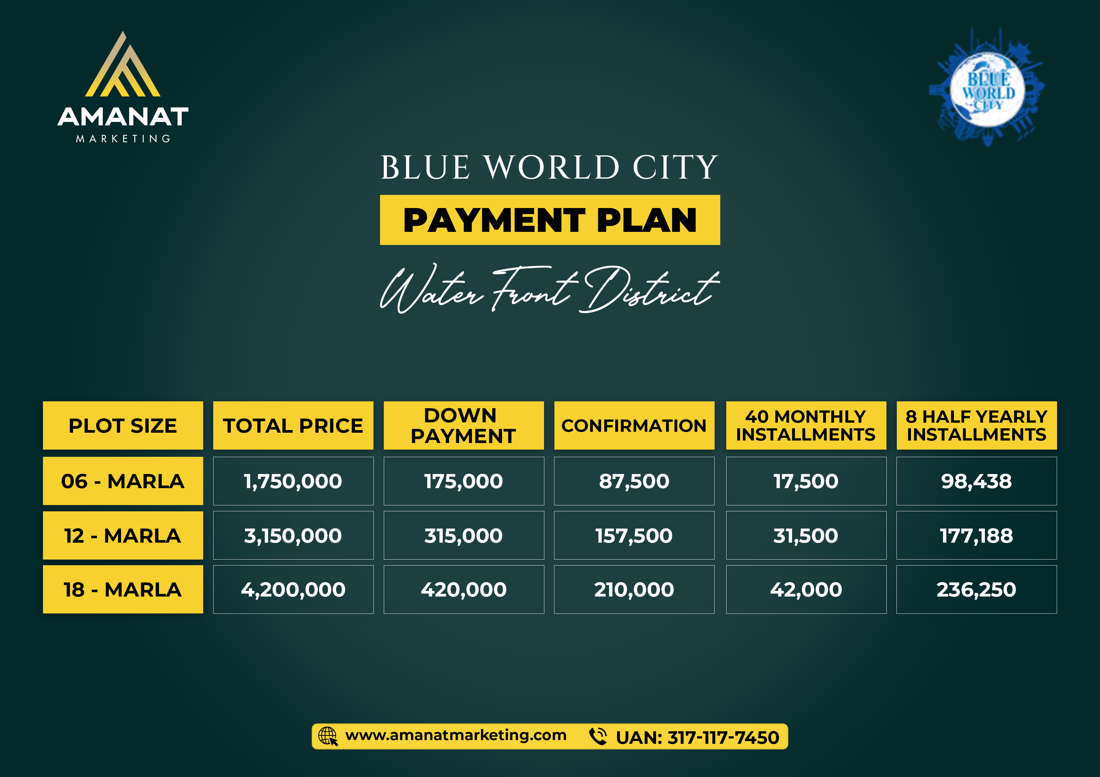 Like most housing societies in the region such as Lahore Smart City and Gulberg Green, Blue world city also offers a very convenient 3 years and 4 years installment plan for a variety of sizes and types of plots for the feasibility of its investors belonging from all classes of society thus making it an ideal and most fitting place to invest your savings in.