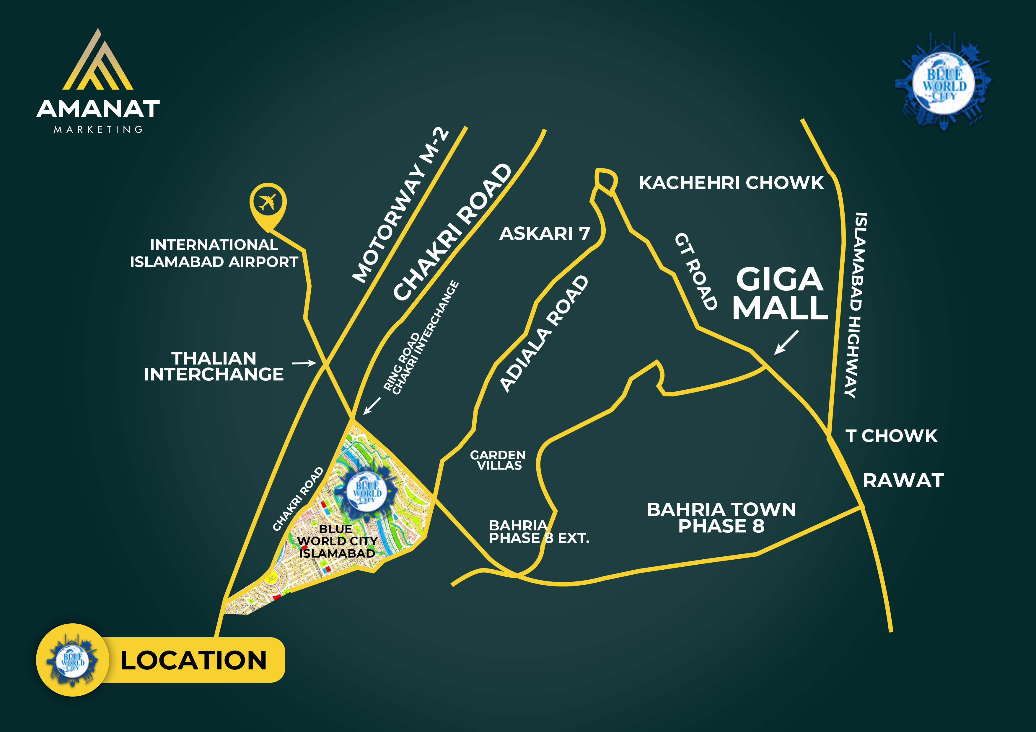 While investing in a property, the foremost concern of the investor is ordinarily the area. Area not as it were characterizing the sense of security but decides the availability of every necessity of the inhabitant. Moreover, A speculator must think about the inclinations and disadvantages of a property’s area before concluding the speculation. Blue World City Islamabad is located on the main Chakri Road adjacent to Chakri Interchange. M-2 Lahore-Islamabad Motorway can easily reach the project. Furthermore, The new Islamabad International airport is also relatively near the project.