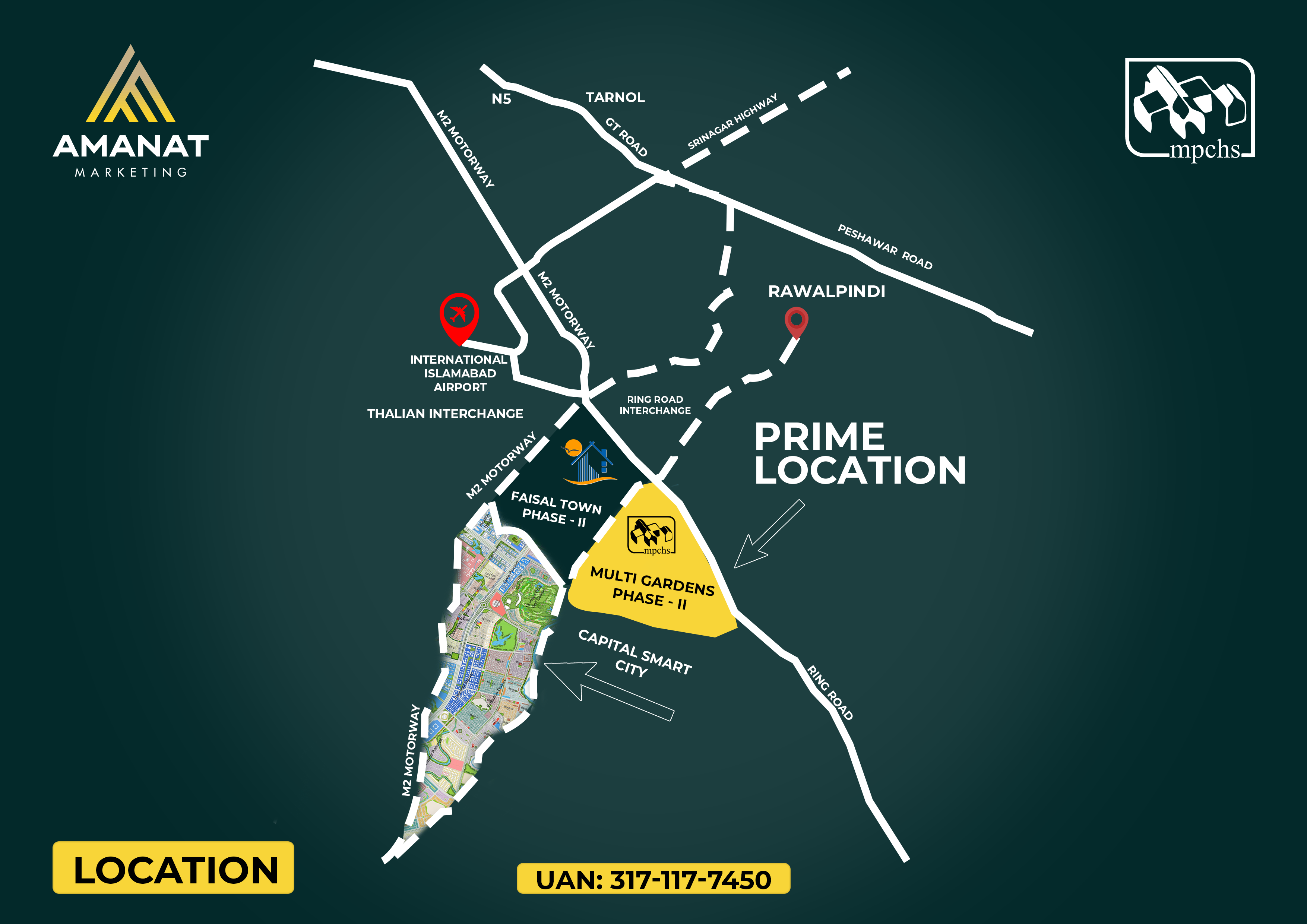 Faisal Town Phase-II is located at Thalian, which is approximately 9 kilometers away from M-2 Toll Plaza. The famous CPEC route and New Islamabad Airport are only 5-6 minutes away from this posh housing society.